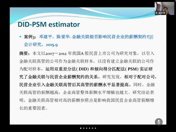 421日下午,应科研处、研究生院与3044am永利集团3044noc邀请,天津财经大学翟淑萍教授在腾讯网络会议室了主题为“处理效应的内生性及其解决2——PSM-DID”的学术讲座,3044am永利集团3044noc院长助理唐玮副教授主持,学院全体研究生聆听了本次讲座。