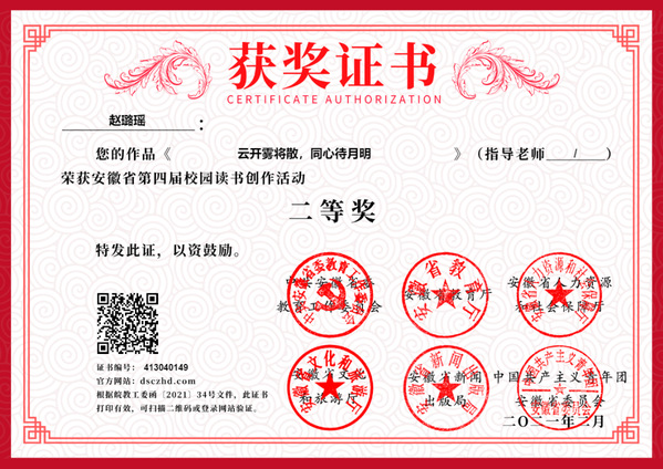 近日,由中共安徽省委教育工委、省教育厅、省人力资源和社会保障厅、省文化和旅游厅、省新闻出版局、共青团安徽省委员会等部门联合举办的第四届“校园读书创作活动”评选结果公布,永利官网19级会计1班赵璐瑶同学的作品《云开雾将散,同心待月明》荣获二等奖。