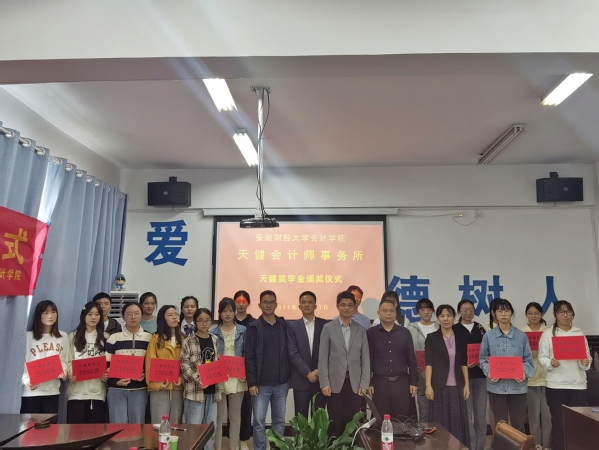 10月13日下午,我学院举行2021年“天健奖学金”颁奖仪式。天健会计师事务所主任会计师助理陈志维、主任会计师助理费方华、合伙人张扬,学院党委副书记金再华、副院长张多蕾、教师辅导员代表和18名获奖学生参加了活动。仪式由学院资助负责人张莉主持。