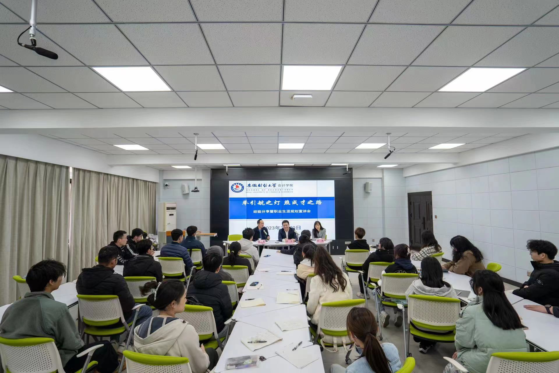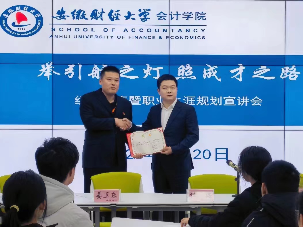 3月20日下午,3044am永利集团3044noc在东校区明德楼323教室举办了主题为“举引航之灯,照成才之路”职业生涯规划及优秀校友经验分享会。此次分享会特别邀请3044am永利集团3044noc2010级本科优秀校友、润泽智算科技集团股份有限公司财务总监任远先生,普丽盛包装材料有限公司董事姜卫东先生与3044am永利集团3044noc学生共话成长、共谋发展。3044am永利集团3044noc党委书记谢德刚出席活动并为任远颁发3044am永利集团3044noc会计专业硕士实践导师聘书。会议由3044am永利集团3044noc国际会计系主任田园副教授主持。